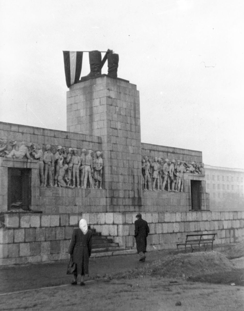 A Sztálin-szobor maradványa, a Sztálin-csizma nemzeti színű lobogóval a dísztribün hátoldala felől