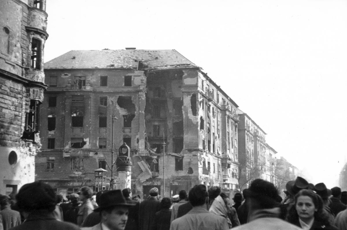 | Címkék: | csoportosulás, épületkár, hirdetőoszlop órával, járókelő, napsütés, rom, tömeg |