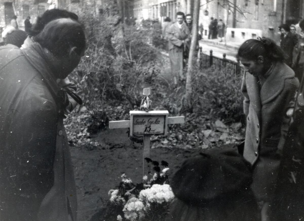 A fejfán felirat: "Szabó Gyula, élt 15 évet." Jobbra a Magyar utca házai