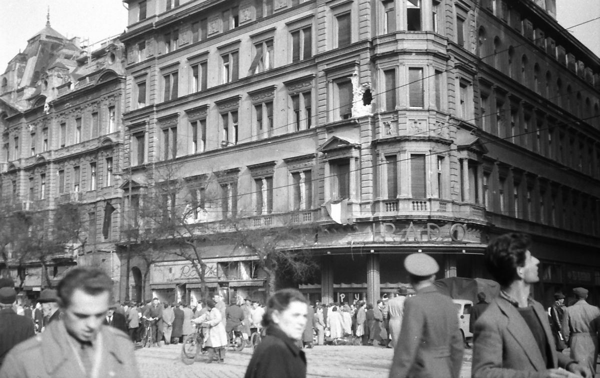 Lövésnyomok a Híradó mozi épületén a Lenin körút és a Dohány utca sarkán