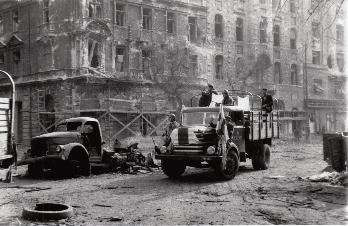 Felkelők egy Csepel teherautón, balra hátul a Práter utca torkolata