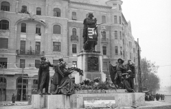 Egy elesett ideiglenes sírja a Pázmány-szobor előtt, a Felszabadulás téren (Ferenciek tere)